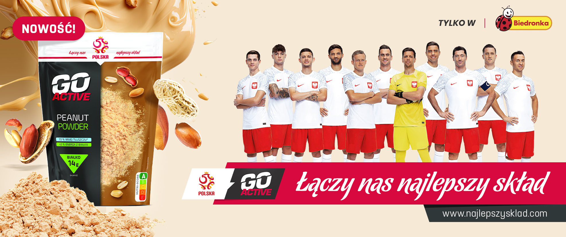 Współpraca Polskiego Związku Piłki Nożnej z siecią Biedronka zaowocowała wprowadzeniem na rynek kolejnego produktu z serii Go Active, sygnowanego logotypem piłkarskiej reprezentacji Polski. Nowość marki własnej pod nazwą Peanut Powder to orzeszki ziemne prażone w formie proszku, o obniżonej zawartości tłuszczu – wspólnie opracowany i polecany przez specjalistów z zakresu żywienia, którzy na co dzień współpracują z reprezentantami i reprezentantkami Polski. Nowy produkt dostępny jest już w sklepach sieci Biedronka!