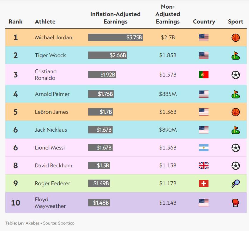 Pierwsze miejsce bez zaskoczeń zajmuje Michael Jordan. Od momentu podpisania indywidualnej umowy z Nike w 1984 roku losy tej współpracy wpłynęły na cały świat sportu. Zarówno legendarny koszykarz, jak i amerykańska marka z roku na rok tylko i wyłącznie rośli na sile. Obrazują to między innymi rosnące przychody marki Jordan, które powodują sytuację, gdzie MJ zarabia aktualnie kilka razy więcej w porównaniu z czasami, gdy grał ponad dwie dekady temu w koszykówkę. Były gracz Chicago Bulls zarobił około 3,75 miliarda dolarów po uwzględnieniu inflacji.