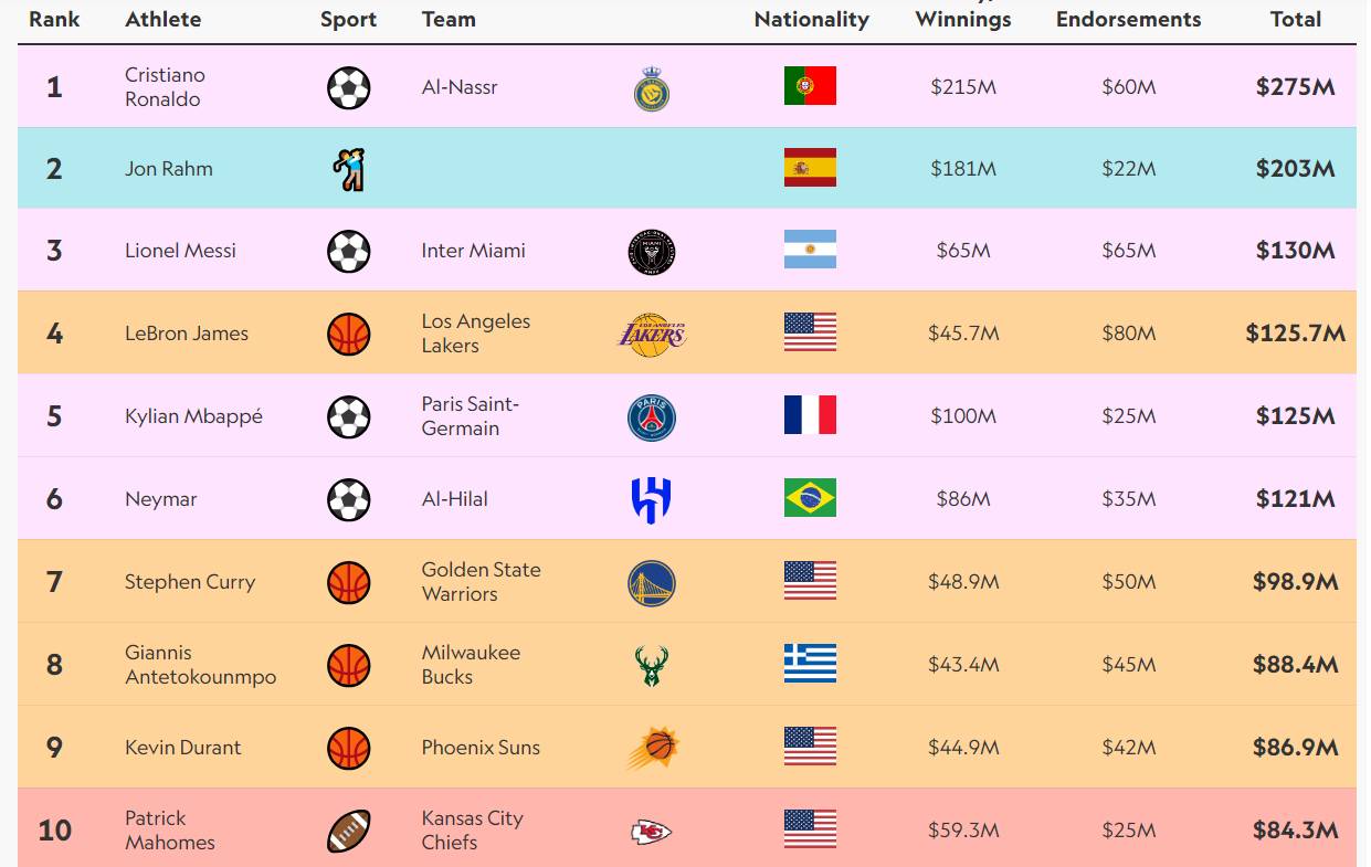 - Na czele rankingu znajduje się Cristiano Ronaldo. Portugalczyk zarobił w ubiegłym roku aż 275 milionów dolarów. W czołowej szóstce znajduje się jeszcze trzech innych piłkarzy: Lionel Messi, Kylian Mbappe i Neymar.