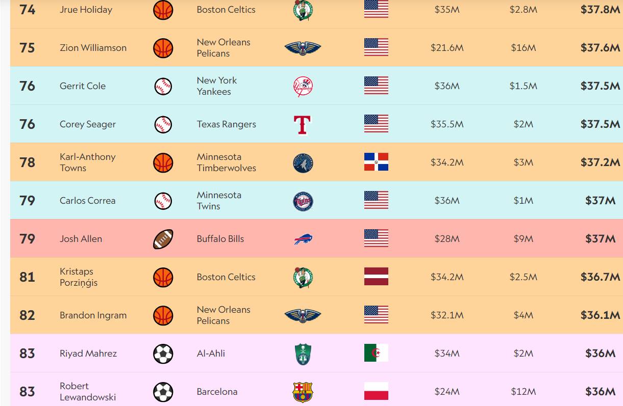 - Tenisistka Coco Gauff była w ubiegłym roku najlepiej zarabiającą sportsmenką z kwotą 22,7 miliona dolarów, ale to nie wystarczyło, aby znaleźć się w zestawieniu.