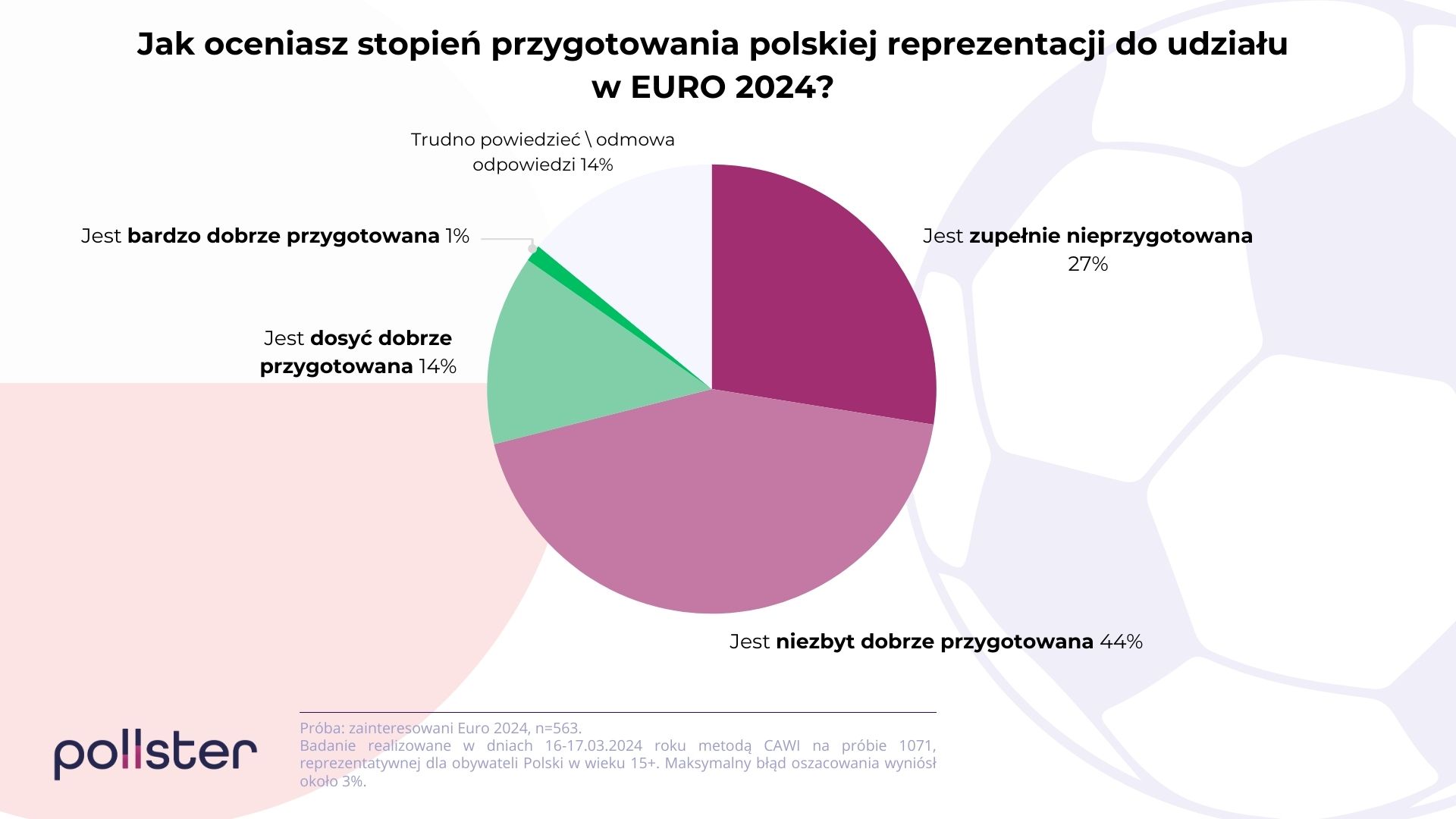 W kwestii przygotowania kadry narodowej do turnieju, polscy fani futbolu nie kryją swoich obaw. Aż 71% osób zainteresowanych piłką nożną uważa, że nasza kadra jest nieprzygotowana do Euro 2024. Dodatkowo, 24% uważa, że Polska nie zakwalifikuje się do turnieju, a 39% sądzi, że nie uda się nam wyjść z grupy.