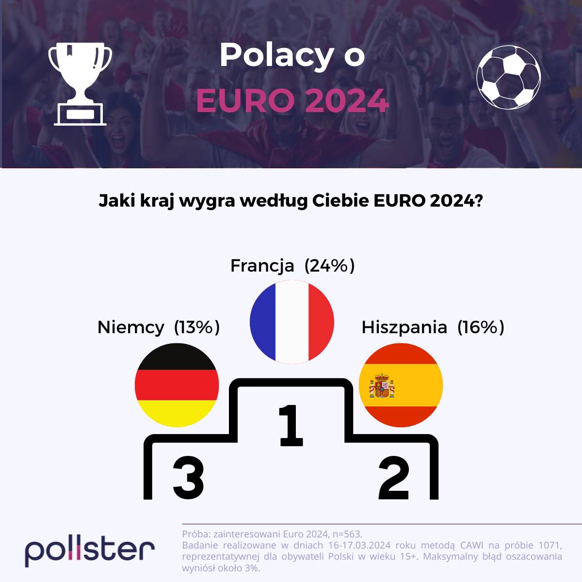 Wśród faworytów turnieju Polacy najczęściej wskazują Francję (24%), Hiszpanię (16%) i Niemcy (13%).