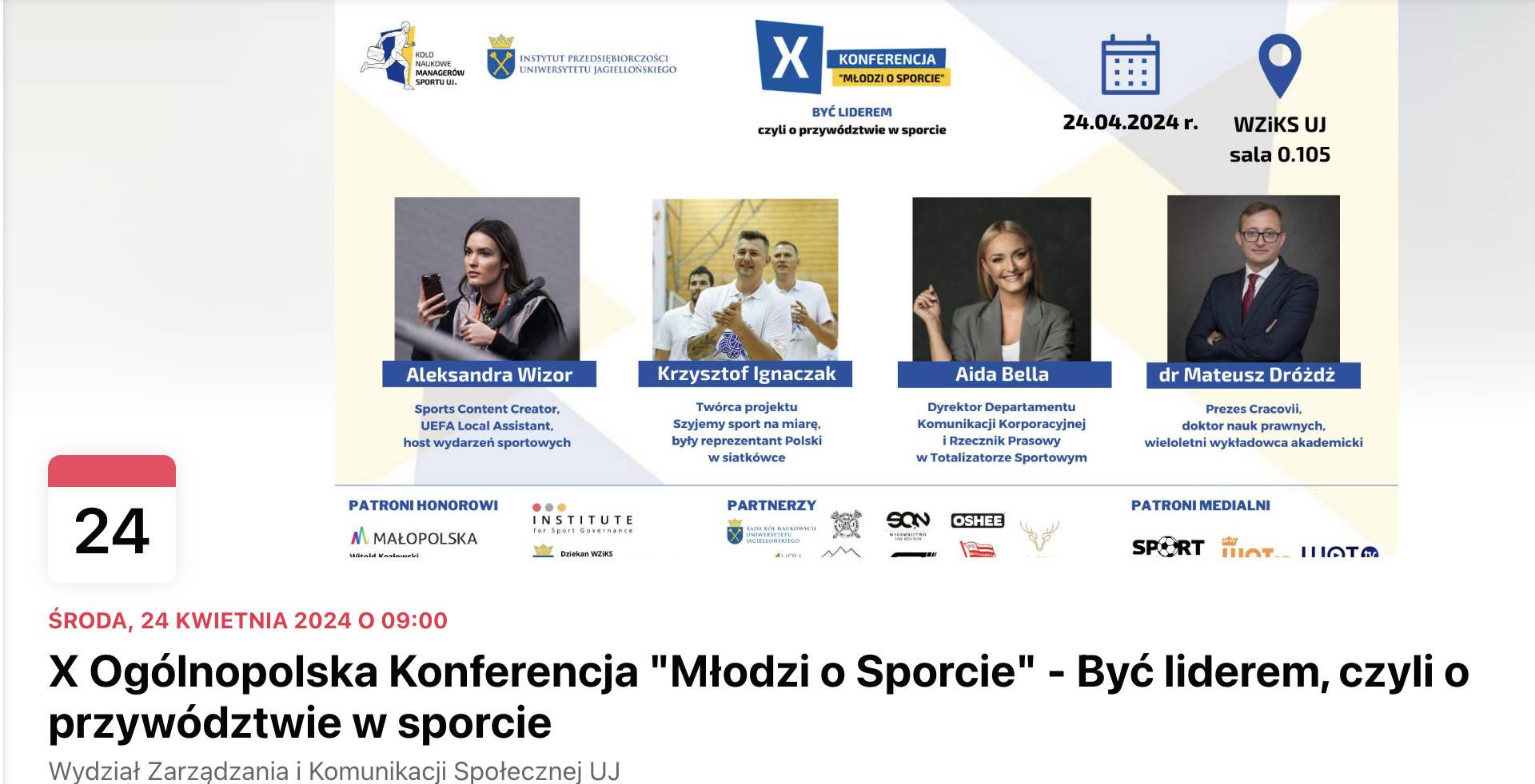 „Koło Naukowe Managerów Sportu UJ ma zaszczyt już po raz dziesiąty zaprosić na konferencję poświęconą zagadnieniom zarządzania w sporcie. Konferencja jest adresowana do wszystkich pasjonatów szeroko rozumianej branży sportowej. Motywem przewodnim tegorocznej konferencji jest przywództwo w sporcie. Organizatorzy zapraszają do zgłaszania posterów i artykułów dotyczących także pozostałych wyzwań zarządzania w sporcie.