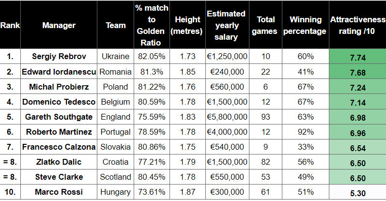 Strona Ticketgum zastosowała system oparty na punktach i wyłoniła wygranych w tym niecodziennym rankingu. Końcowo to trener Ukrainy Serhij Rebrow zdobył tytuł najseksowniejszego menadżera, który poprowadzi swoją drużynę na Euro w Niemczech. Ogólna ocena jego atrakcyjności wyniosła 7,74/10. Co nie wydaje się i tak być ogromnym wynikiem. Drugie miejsce zajmuje menadżer Rumunii Edward Iordanescu z oceną na poziomie 7,68/10.