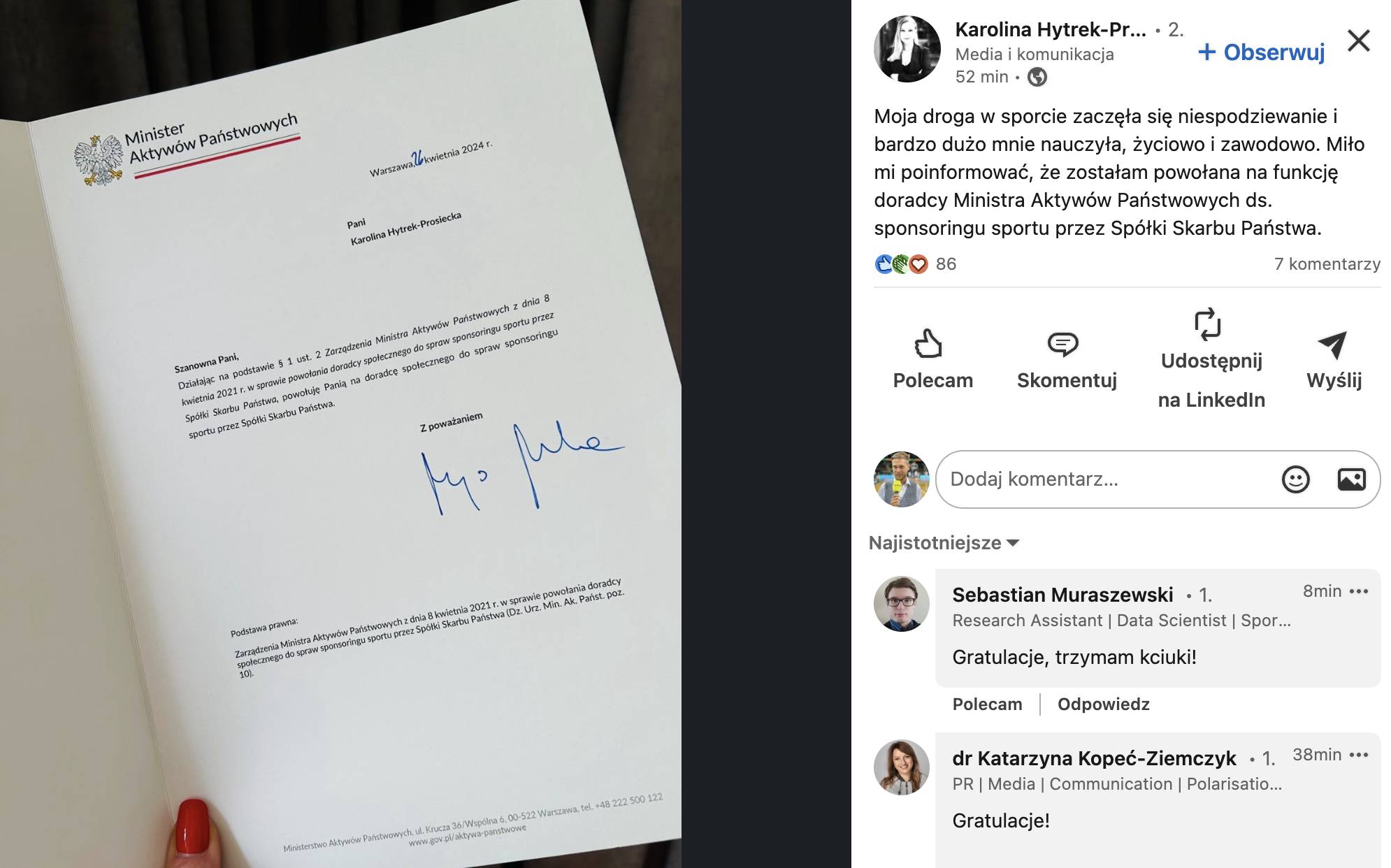 „Moja droga w sporcie rozpoczęła się niespodziewanie i bardzo dużo mnie nauczyła, życiowo i zawodowo. Miło mi poinformować, że zostałam powołana na funkcję doradcy Ministra Aktywów Państwowych do spraw sponsoringu sportu przez Spółki Skarbu Państwa” — napisała Karolina Hytrek-Prosiecka w swoich mediach społecznościowych.