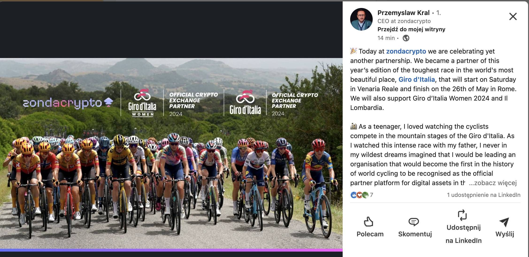 „Dziś w zondacrypto świętujemy kolejne partnerstwo. Zostaliśmy partnerem tegorocznej edycji najtrudniejszego wyścigu w najpiękniejszym miejscu na świecie – Giro d’Italia, który rozpocznie się w sobotę w Venaria Reale i zakończy 26 maja w Rzymie. Będziemy również wspierać Giro d’Italia Women 2024 i Il Lombardia.