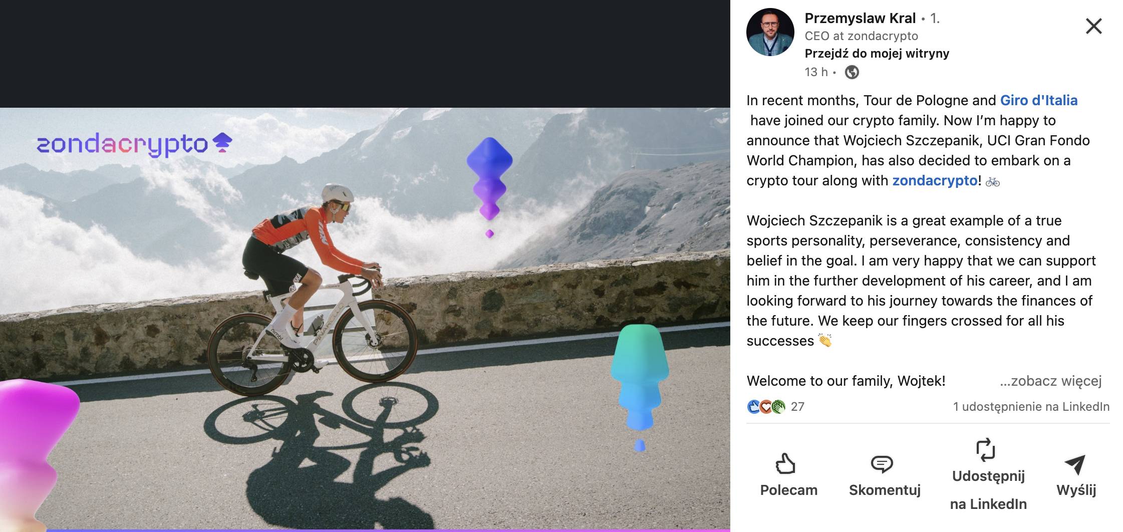 „W ostatnich miesiącach do naszej rodziny partnerów dołączyły Tour de Pologne i Giro d’Italia. Teraz miło mi ogłosić, że Wojciech Szczepanik, Mistrz Świata UCI Gran Fondo, również wyruszy w kryptowalutową trasę wraz z zondacrypto” – napisał Przemysław Kral, CEO zondacrypto.