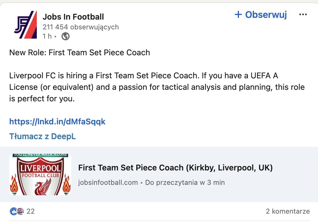 „Liverpool FC zatrudni trenera od stałych fragmentów gry w pierwszej drużynie. Jeśli masz licencję UEFA A (lub równoważną) i pasję do analizy taktycznej oraz planowania, ta rola jest dla ciebie idealna” – czytamy na Linkedin. Ofertę można znaleźć po wyszukaniu konta „Jobs in Football”. Trzeba przyznać, że w przypadku klubu, który ma globalną renomę, należy do absolutnego topu, taka publikacja oferty może zaskakiwać.