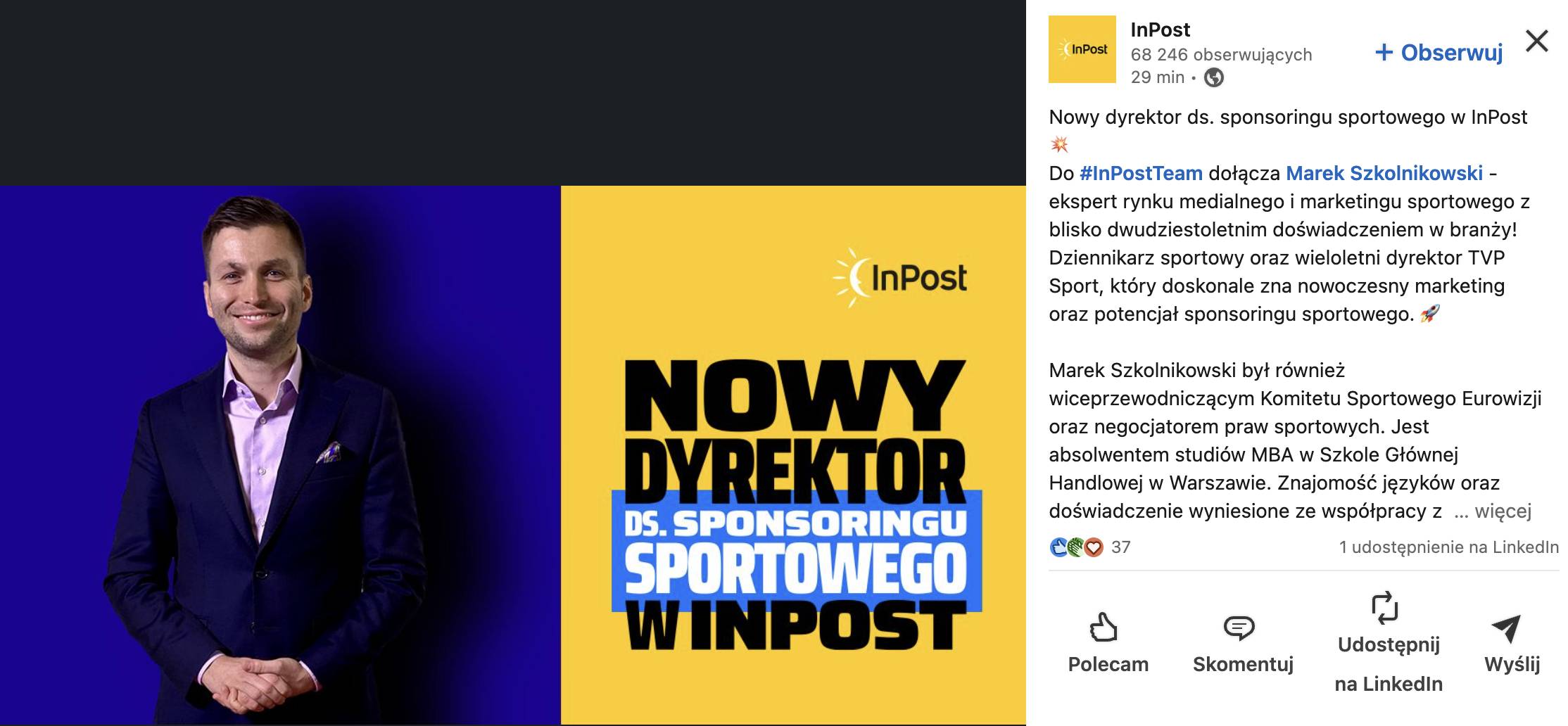 „Do #InPostTeam dołącza Marek Szkolnikowski – ekspert rynku medialnego i marketingu sportowego z blisko dwudziestoletnim doświadczeniem w branży! Dziennikarz sportowy oraz wieloletni dyrektor TVP Sport, który doskonale zna nowoczesny marketing oraz potencjał sponsoringu sportowego. 🚀