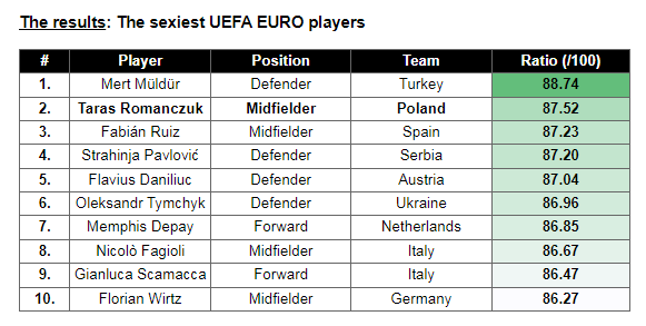 Taras Romanczuk jest najseksowniejszym piłkarzem w Polsce, z wynikiem atrakcyjności 87,52/100. Serbia jest najatrakcyjniejszą drużyną EURO 2024, szczycąc się średnim wskaźnikiem atrakcyjności twarzy 77,90/100, a obrońca Strahinja Pavlović uzyskał wynik 87,20/100. Mert Müldür (Turcja) jest najseksowniejszym piłkarzem, uzyskując wynik 88,74/100 za atrakcyjność. Szwajcaria ma najmniej atrakcyjną drużynę według złotego podziału, uzyskując wynik 68,13/100.