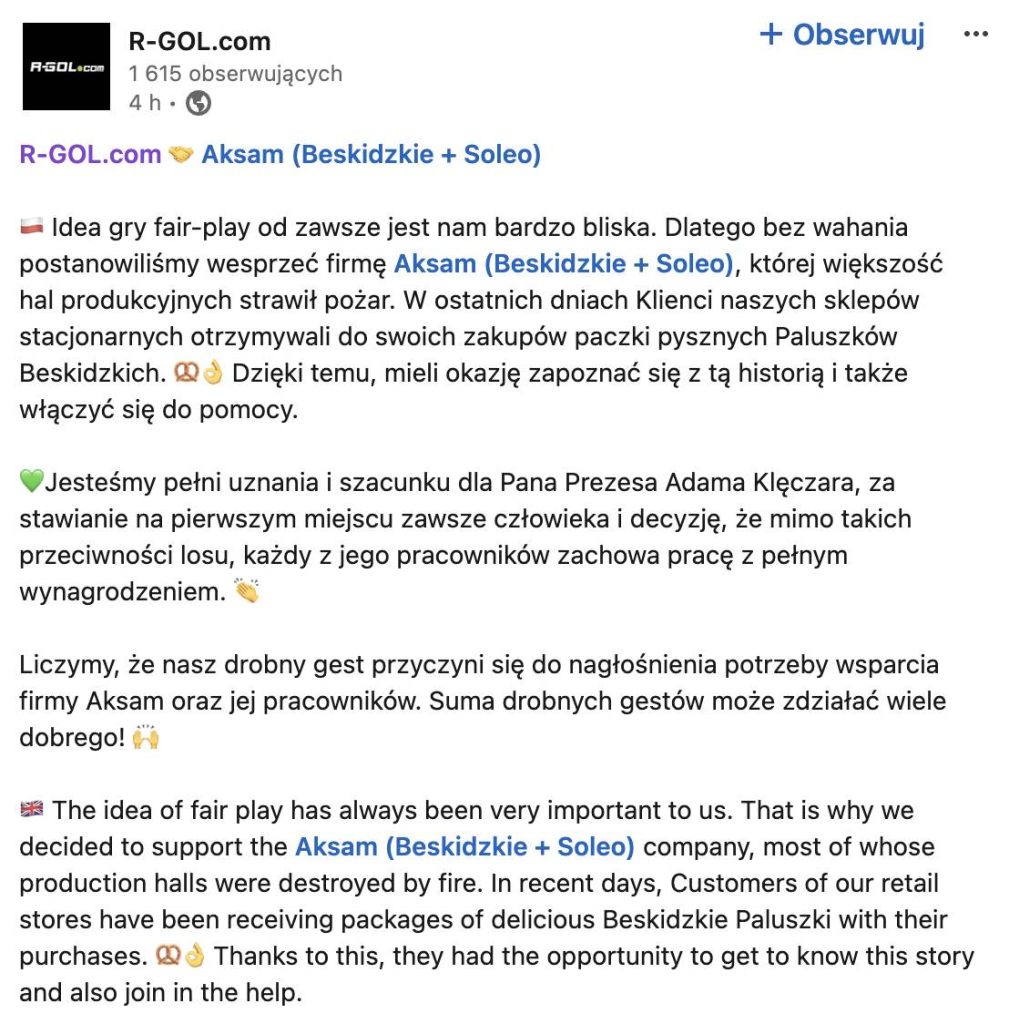 R.Gol.com zaznacza, że idea gry fair-play od zawsze jest mu bardzo bliska. Dlatego bez wahania postanowił wesprzeć firmę Aksam (Beskidzkie+Soleo), której większość hal produkcyjnych strawił pożar. W ostatnich dniach klienci tych sklepów stacjonarnych otrzymywali do swoich zakupów paczki Paluszków Beskidzkich. Dzięki temu, mieli okazję zapoznać się z tą historią i także włączyć się do pomocy.