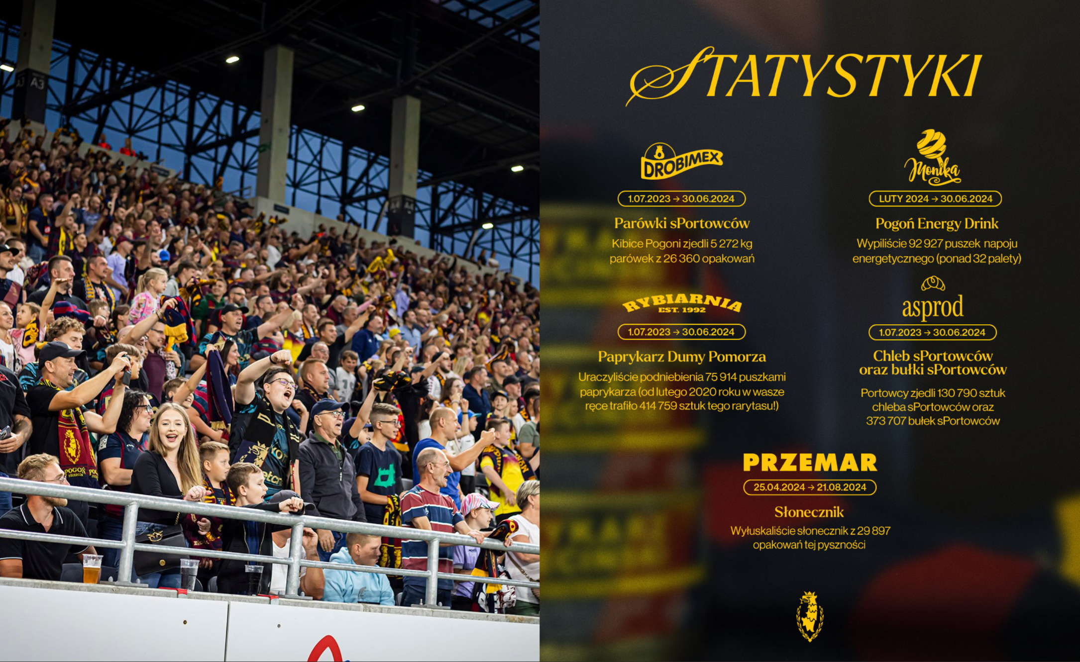 Pogoń przyjrzała się statystykom sprzedażowym wspomnianych rarytasów za ubiegły sezon. Wyjątek stanowiły dane odnoszące się do sprzedaży słonecznika oraz napoju energetycznego, ponieważ te produkty pojawiły się w dystrybucji już w trakcie sezonu. Ostatecznie, pod uwagę wzięto parówki sPortowców, Pogoń Energy Drink, paprykarz Dumy Pomorza, bułki sPortowców, chleb sPortowców oraz słonecznik.