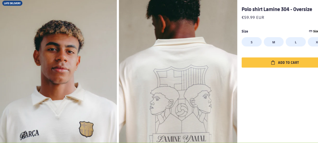 Pamiątkowa koszulka, którą można kupić online w oficjalnym sklepie Barcelony, kosztuje 59,99 euro, czyli 261,10 zł (https://store.fcbarcelona.com/products/trophy-m-lamine-ecru-ss-polo).