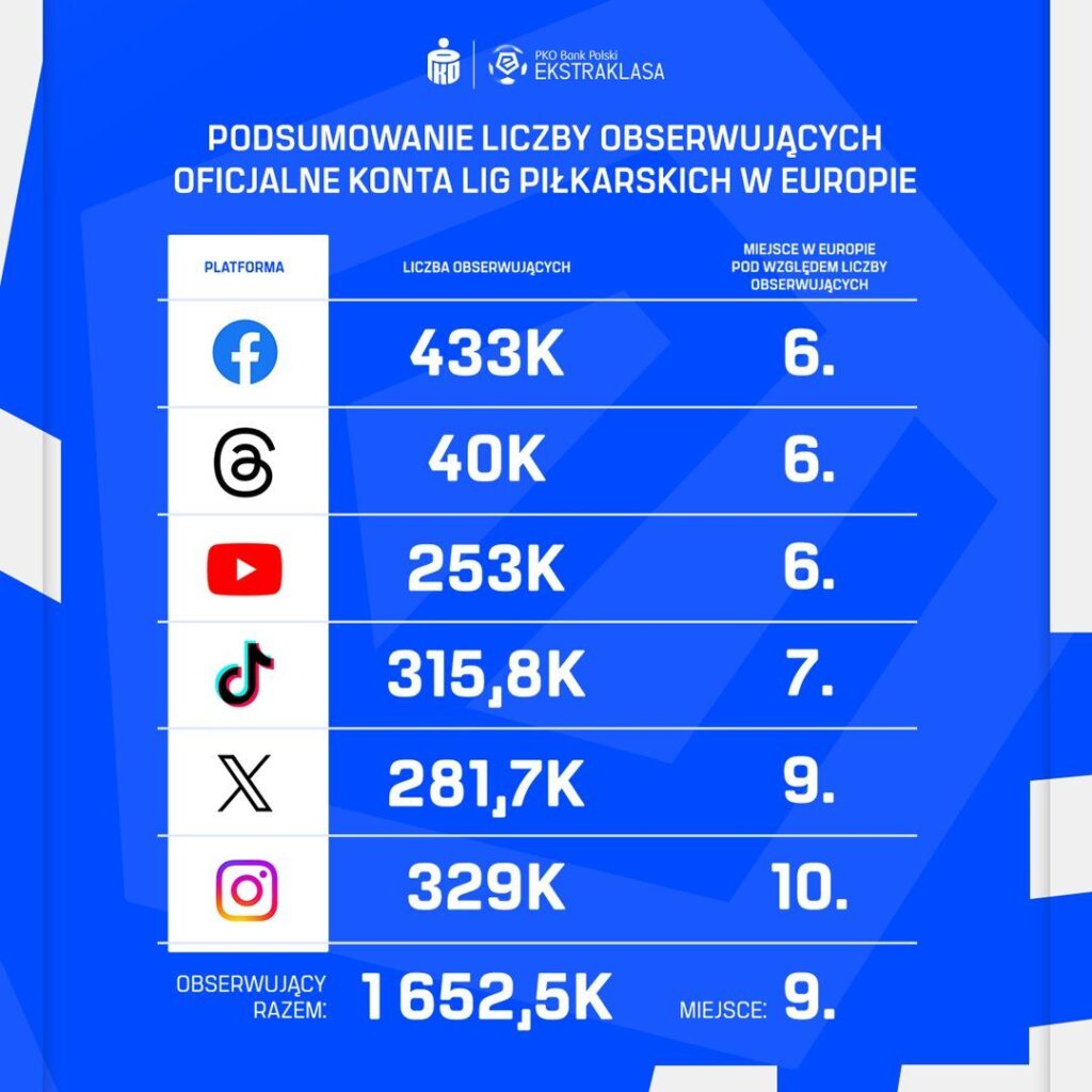 Obecność PKO BP Ekstraklasy w mediach społecznościowych stale rośnie! PKO BP Ekstraklasa zajmuje wysokie miejsca w rankingach obserwujących oficjalne konta lig piłkarskich w Europie.