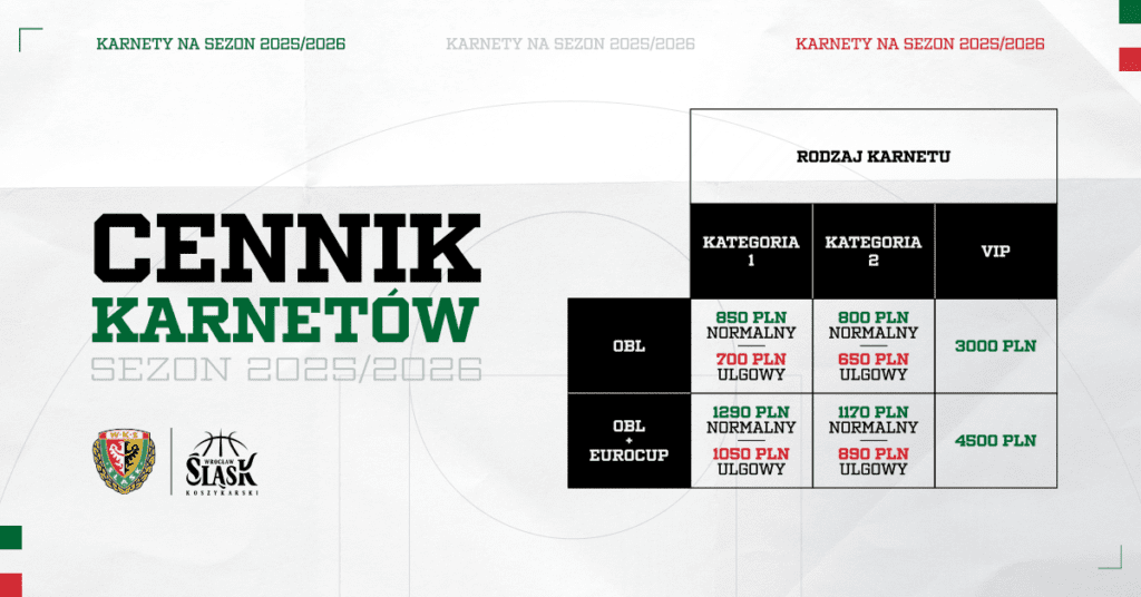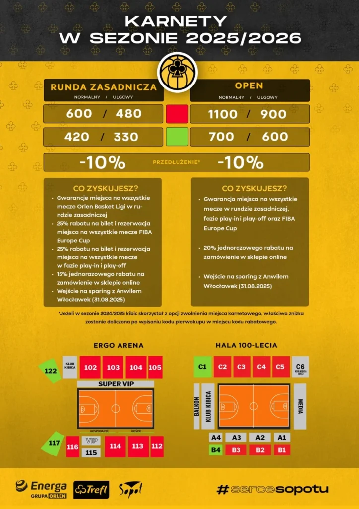 Do 26 września 2025 do godziny 18:00 obowiązuje prawo pierwokupu na zajmowane dotychczas miejsce dla posiadaczy karnetów na rozgrywki w sezonie 2024/2025. W przypadku braku zakupu miejsca takie trafią do ogólnodostępnej sprzedaży. Dla posiadaczy karnetów z poprzedniego sezonu przygotowaliśmy 10% zniżki! 669,50-875,50 zł to ceny karnetów, które wciąż są dostępne online.
