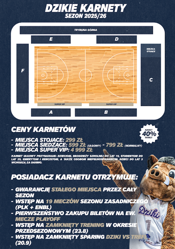 Od sezonu 2025/26 Dziki korzystają z własnego, dedykowanego systemu biletowego. Oznacza to między innymi, że podane ceny są finalnymi – kupujący nie ponosi ŻADNYCH dodatkowych kosztów serwisowych.
