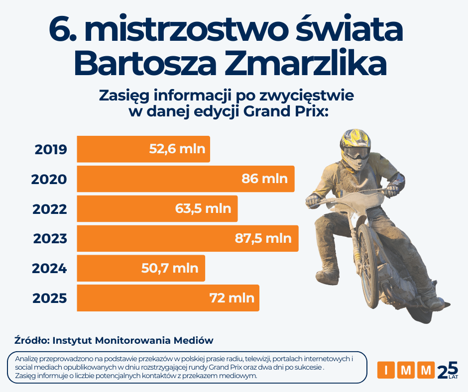 Każde mistrzostwo Zmarzlika generowało duże zainteresowanie w mediach. Jak pokazują dane Instytutu Monitorowania Mediów najnowszy, szósty tytuł z 2025 roku osiągnął ponad 72 mln kontaktów medialnych, co stawia go w ścisłej czołówce dotychczasowych sukcesów sportowca.