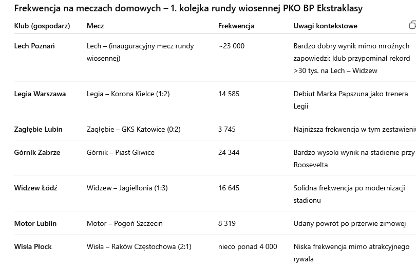 W trakcie pierwszej rundy wiosennej rozegrano wszystkie zaplanowane mecze zgodnie z terminarzem, obejmujące starcia takich drużyn jak Legia Warszawa, Lechia Gdańsk czy Pogoń Szczecin. Każde z nich przyciągnęło liczną publiczność. Tendencja jest wyraźna: zarówno w dużych miastach, jak i na mniejszych stadionach kibice chętnie wracają na trybuny po zimowej przerwie.