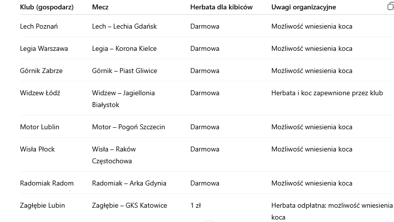 Niektóre kluby postanowiły dodatkowo zadbać o komfort kibiców w mroźne dni. Wszystkie osiem klubów, które od piątku do niedzieli rozgrywały mecze u siebie, zapewniło przy okazji spotkania inaugurującego wiosnę fanom darmową herbatę, a kibice mogą swobodnie wnosić koce na trybuny, żeby łatwiej przetrwać chłód i w pełni cieszyć się widowiskiem. To nietypowy, ale bardzo pozytywnie przyjmowany gest organizacyjny, który pokazuje, jak kluby potrafią reagować na potrzeby swoich fanów w trudnych warunkach pogodowych.