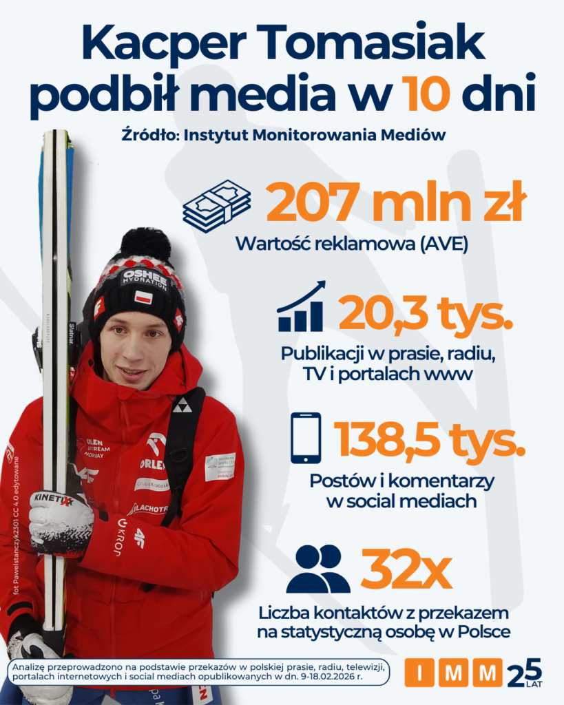 Choć emocje po rozstrzygnięciu plebiscytu Sportowiec Roku 2025 dopiero co opadły, uwaga kibiców, marek i mediów bardzo szybko skupiła się na nowym bohaterze. Olimpijskie występy Kacper Tomasiak wywołały prawdziwą lawinę publikacji. Jak wynika z danych Instytut Monitorowania Mediów, w ciągu zaledwie kilku dni sportowiec wygenerował ponad 207 mln zł ekwiwalentu reklamowego (AVE), a przeciętny Polak mógł natknąć się na informacje o jego sukcesach średnio 32 razy.