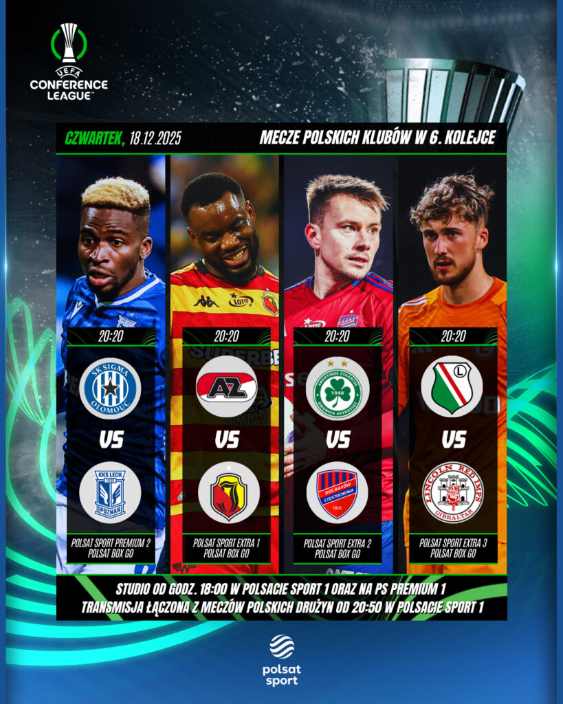 18 grudnia uczestnicy Ligi Konferencji rozegrają ostatnie spotkania jesiennej części sezonu. Każdy mecz i każdy gol będzie decydować o tym, kto zachowa szanse, by wiosną kontynuować walkę o trofeum. Dlatego wszystkie czwartkowe starcia rozpoczną się o tej samej godzinie, a interaktywna tabela będzie zmieniała się z każdą sekundą. Z tej okazji sportowa redakcja Polsatu przygotowała dla kibiców wyjątkowy format transmisji łączonej z czterech różnych stadionów, na których wystąpią Raków, Jagiellonia, Lech oraz Legia.