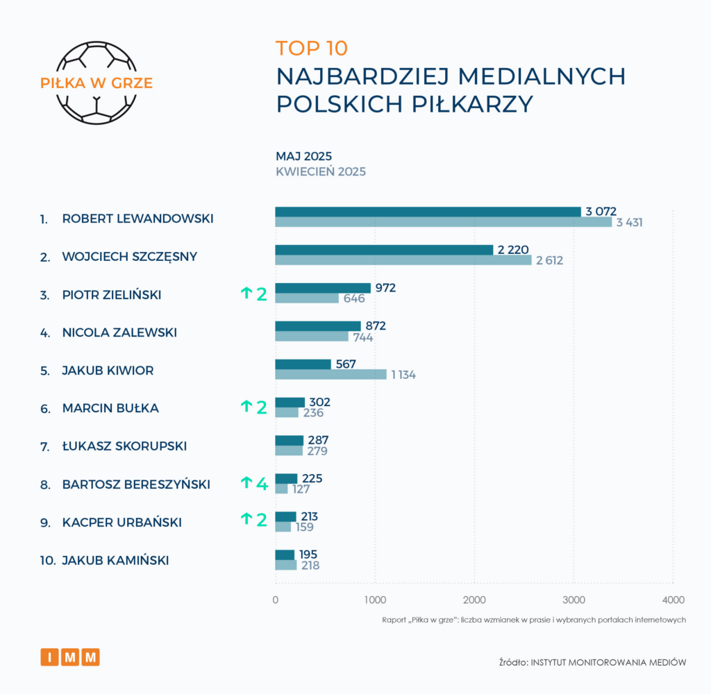 Ranking medialności „Piłka w grze” polskich piłkarzy otworzył ponownie duet z FC Barcelony – Robert Lewandowski i Wojciech Szczęsny. Podium zamknął Piotr Zieliński, który wraz z Interem Mediolan walczył do końca sezonu o mistrzostwo Włoch. Zawodnicy Dumy Katalonii sprostali oczekiwaniom i zdobyli Puchar Króla oraz triumfowali w lidze hiszpańskiej. Półfinałowy dwumecz w Lidze Mistrzów między FC Barceloną a Interem Mediolan obfitował w wiele bramek i był prawdziwą ucztą dla oka piłkarskich kibiców. W social mediach często pojawiał się kontekst polskich zawodników, którzy rywalizowali ze sobą o przejście do prestiżowego finału Ligi Mistrzów. W związku z tym kolejna dwójka piłkarzy w zestawieniu IMM to właśnie zawodnicy włoskiego Interu – Piotr Zieliński i Nicola Zalewski. Mediolan najpierw mógł świętować zwycięstwo nad FC Barceloną i przygotowywać się do wielkiego finału z PSG, ale jednocześnie trwała także walka o tytuł mistrza kraju. Ostatecznie jednak Inter najpierw musiał obejść się smakiem Scudetto i przegrał z Napoli o jeden punkt w ligowej tabeli, a następnie ulegli drużynie z Paryża 0:5 w finale Ligi Mistrzów. Czołową piątkę zamknął Jakub Kiwior – obrońca wicemistrza Anglii, Arsenalu Londyn. Nasz reprezentant zebrał sporo pozytywnych opinii w ostatnich tygodniach i upatruje się w nim filar defensywy kadry Polski.