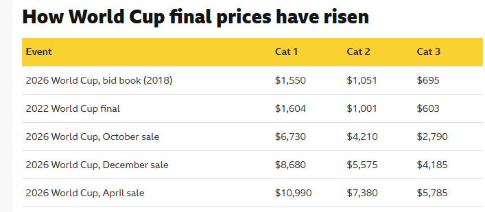 Pierwsza otwarta sprzedaż biletów na Mistrzostwa Świata w 2026 roku pokazała, że FIFA żąda za wstęp na finał nawet 10 990 dolarów (8333 funtów).