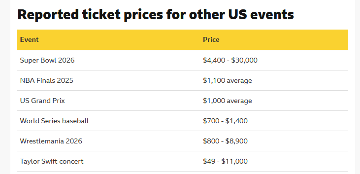 Uważa się, że jest to najdroższy w historii bilet wstępu na mecz piłkarski, biorąc pod uwagę ceny w kasach biletowych, a nie na rynku wtórnym. W swoich ofertach na mundial Stany Zjednoczone, Kanada i Meksyk podały, że bilety na finał będą kosztować maksymalnie 1550 dolarów (1174 funty). Kiedy w grudniu bilety trafiły do sprzedaży dla członków oficjalnych klubów kibiców każdego z tych krajów, najdroższa cena wynosiła 8680 dolarów (6581 funtów).