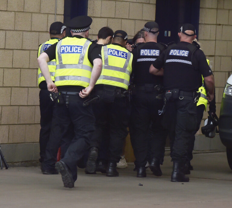 A protestor managed to chain himself to the goal post and delayed the start of the game before being led away by Police Scotland
