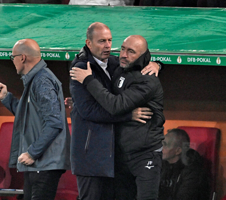 29.10.2024, Fussball DFB-Pokal 2024/2025, 2.Runde, FC Augsburg - FC Schalke 04, in der WWK-Arena Augsburg. Trainer Jess Thorup FC Augsburg und Co-Trainer Jacob Friis FC Augsburg. ***DFL and DFB regulations prohibit any use of photographs as image sequences and/or quasi-video.*** *** 29 10 2024, Football DFB Pokal 2024 2025, 2 Round, FC Augsburg FC Schalke 04, in the WWK Arena Augsburg Coach Jess Thorup FC Augsburg and Co Coach Jacob Friis FC Augsburg DFL and DFB regulations prohibit any use of photographs as image sequences and or quasi video