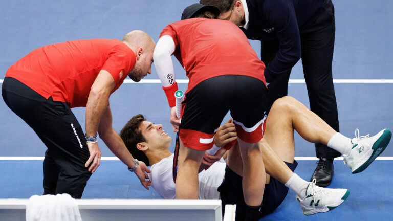 Chilean Cristian Garin, is helped by, Belgian captain Steve Darcis, Belgian Zizou Bergs and during a game between Belgian Bergs and Chilean Garin, the fourth match in the Davis Cup qualifiers World Group tennis meeting between Belgium and Chile, Sunday 02 February 2025, in Hasselt. BELGA PHOTO BENOIT DOPPAGNE (Photo by BENOIT DOPPAGNE/Belga/Sipa USA)