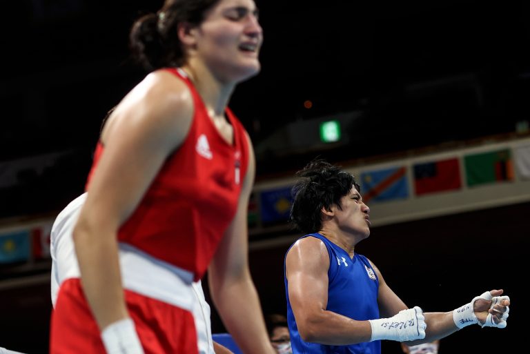 (210727) -- TOKYO, July 27, 2021 (Xinhua) -- Chen Nien-chin (in blue) of Chinese Taipei and Angela Carini of Italy react during the women's welter 64-69kg preliminaries match of boxing at Tokyo 2020 Olympic Games in Tokyo, Japan, July 27, 2021. (Xinhua/Ou Dongqu)