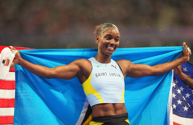 August 03 2024: Julien Alfred (Saint Lucia) winning gold at Women's 100m Final on Day 8 of the Olympic Games  at Stade de France, Paris, France. Ulrik Pedersen/CSM/Sipa USA. (Credit Image: © Ulrik Pedersen/Cal Sport Media/Sipa USA)
