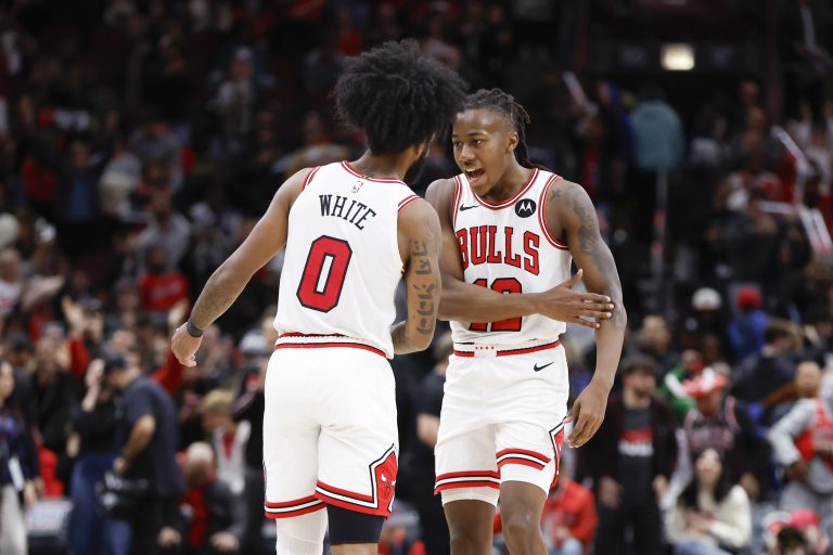Dec 2, 2023; Chicago, Illinois, USA; Chicago Bulls guard Coby White (0) celebrates with guard Ayo Dosunmu (12) after defeating the New Orleans Pelicans at United Center. Mandatory Credit: Kamil Krzaczynski-USA TODAY Sports/Sipa USA