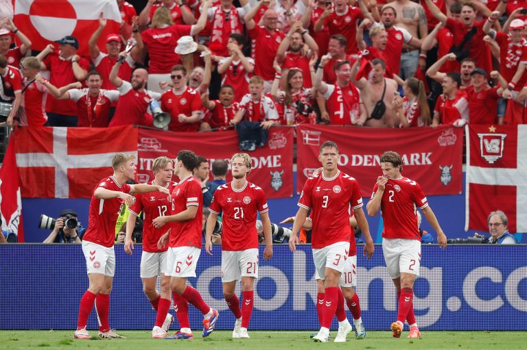 Morten Hjulmand of Denmark celebrates scoring his side’s 1st goal during the UEFA Euro 2024 Group C match between Denmark and England at the Deutsche Bank Park, Frankfurt