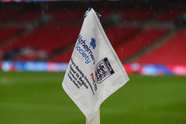 Alzheimer's Society International England vs Belgium 26th of March 2024 Wembley Stadium corner flag to help to highlight memory loss as one of the symptoms of dementia  during the International Friendly match England vs Belgium at Wembley Stadium, London, United Kingdom, 26th March 2024