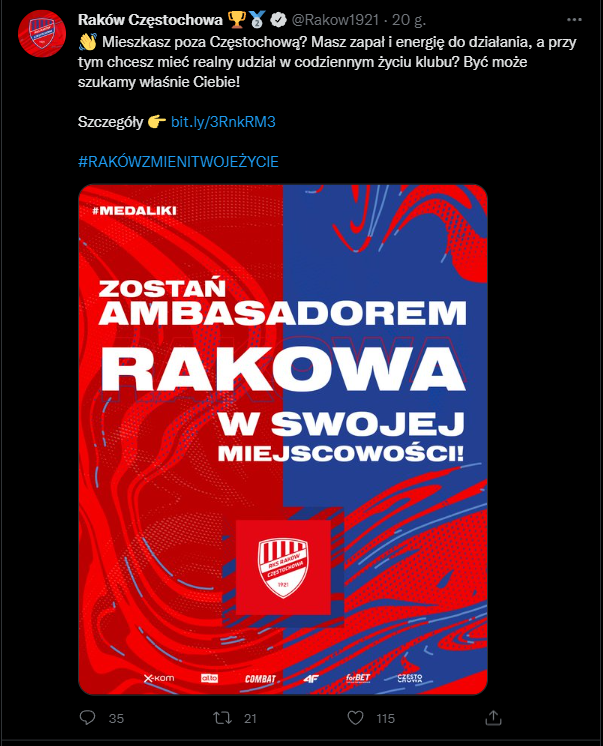 Jednym z najnowszych pomysłów Rakowa Częstochowa jest akcja „Zostań Ambasadorem Rakowa”. W jaki sposób mają wyglądać obowiązki ambasadora i na czym on miały się skupiać? Z komunikatu wiemy tyle, by chętni zwyczajnie zgłaszali się do klubu.