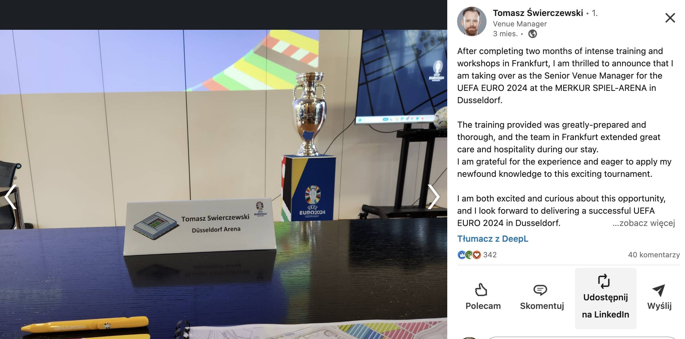 Tomasz Świerczewski, Venue Manager stadionu w Duesseldorfie podczas UEFA Euro 2024: – Jednym z większych to na pewno. To drugi tego rozmiaru turniej, przy którym mam okazję pracować w pełnym wymiarze jako Venue Manager. Muszę powiedzieć, że mundial w Katarze był „większy”. Był to mój pierwszy taki turniej, pierwszy raz byłem tak długo poza domem, w nowym środowisku, w zupełnie innej kulturze. Tam było jeszcze bardziej wymagająco, choć nie powiem, że tutaj jest dużo łatwiej. W Niemczech jest wiele biurokracji, przepisów, ograniczeń. Największym wyzwaniem jest zawsze bycie wrzuconym w nowe środowisko, gdzie trzeba bardzo szybko się odnaleźć, żeby w określonym czasie zrobić to, czego od nas oczekują.