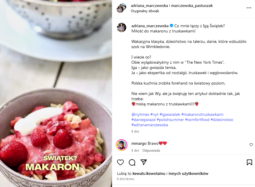 Adrianna Marczewska, szefowa kuchni i dziennikarka kulinarna: – Tak, to była niespodzianka, bo redaktorka z „New York Timesa” skontaktowała się ze mną bezpośrednio mailowo i poprosiła o udzielenie wypowiedzi o makaronie z truskawkami w kontekście Igi Świątek. Z maila dowiedziałam się, że danie wzbudziło ogromne emocje, ponieważ okazało się, że dla Amerykanów było zupełnie nieznane. Oczywiście sama Iga też budzi duże zainteresowanie, więc skoro zdradziła coś ze swojej diety, ze swojego kraju i domu, to od razu przyciągnęło uwagę.