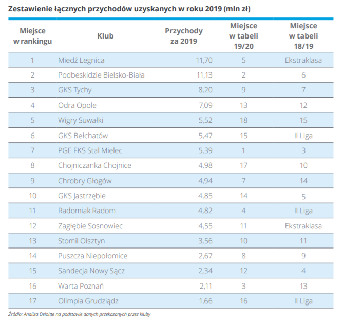 Najlepsza drużyna sezonu 2019/20 uplasowała się dopiero na siódmej pozycji w rankingu. Stal Mielec uzyskała 5,39 mln złotych przychodu. Niewiele ponad 2 mln złotych zasiliły kasę Warty Poznań. To drugi najgorszy wynik w lidze, co nie przeszkodziło Zielonym po wielu latach uzyskać awansu do PKO Ekstraklasy.