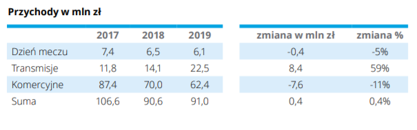 Łącznie dochód pierwszoligowców wyniósł 91 milionów złotych. To co prawda o 0,4 mln więcej niż w poprzednim sezonie, jednak kluby nie mają powodów do zadowolenia. Wynik jest lepszy w stosunku do ubiegłego roku tylko przez wzrost o 8,4 mln zł (aż 59%) kwoty otrzymanej z tytułu praw telewizyjnych. Przychody komercyjne spadły o 7,6 mln złotych (11%), a wypływy dnia meczowego o 400 tys. (5%).