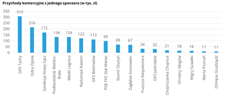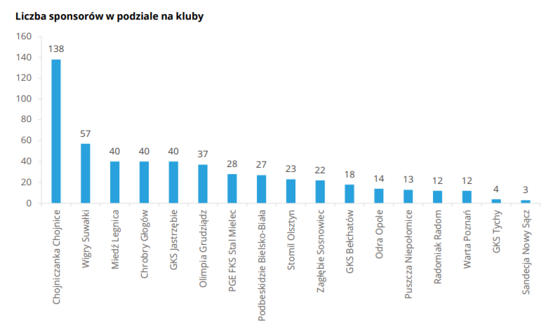 Kluby budują swoje sponsorskie hierarchie w różny sposób. Dla mniejszych ekip liczy się każde wsparcie, niektóre z ekip postawiły na konkretne partnerstwa. Pod względem średniej przychodów z komercyjnego sponsora liderem rankingu jest tyski GKS, który otrzymywał średnio 310 tys. złotych od partnera. Na szarym końcu Warta Poznań i Olimpia Grudziądz z kwotami o blisko 300 tys. niższymi.