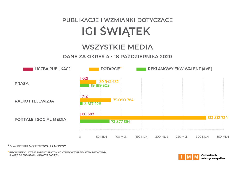 Najwyższą wartość dotarcia zaobserwowano natomiast na platformie Facebook (133 tys. potencjalnych kontaktów), gdzie w okresie 2 tygodni pojawiło się ponad 3,5 tys. materiałów, a najwyższy ekwiwalent reklamowy (AVE) wygenerowały portale internetowe (56 mln zł), gdzie pojawiło się prawie 11 tys. publikacji.