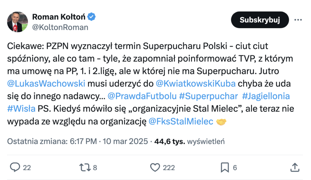 Nie tylko kwestia transmisji tego spotkania wywołuje zamieszanie, ponieważ nadal pozostaje istotna niewiadoma. Prezes Wisły Kraków otwartym tekstem mówi, że jeśli fani drużyny z Małopolski nie dostaną zgody, by wejść na trybuny podczas tej rywalizacji, Wisła zbojkotuje mecz. Może być jeszcze gorąco zatem wokół Superpucharu, na którego rozegranie kibice czekają od dłuższego czasu.