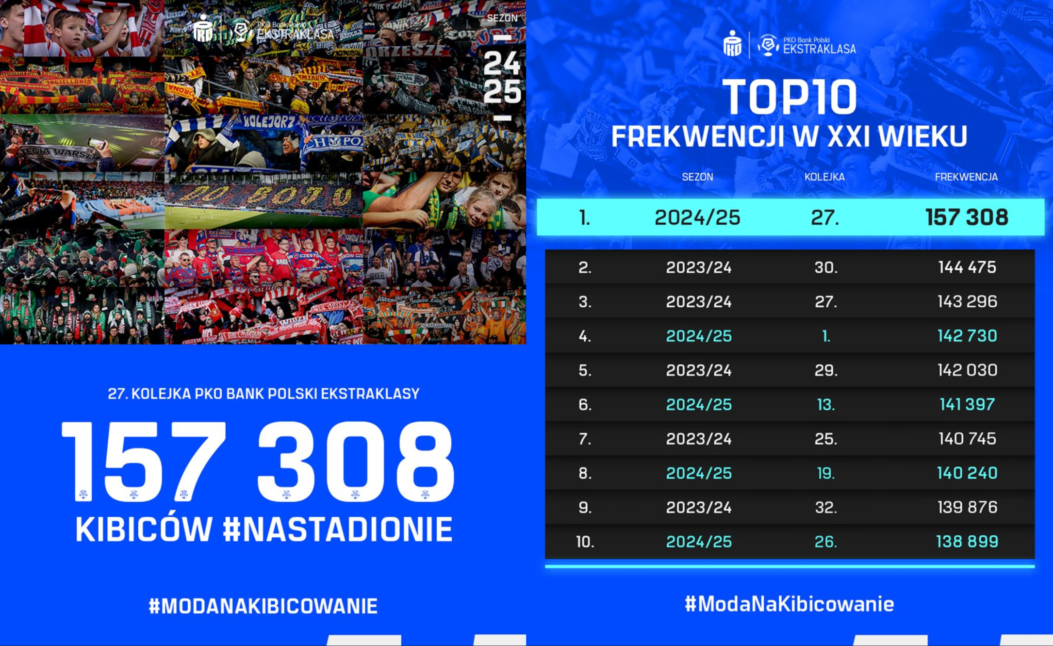 27. kolejka obecnego sezonu przyciągnęła na trybuny 157 308 kibiców – to najwyższy wynik w XXI wieku!