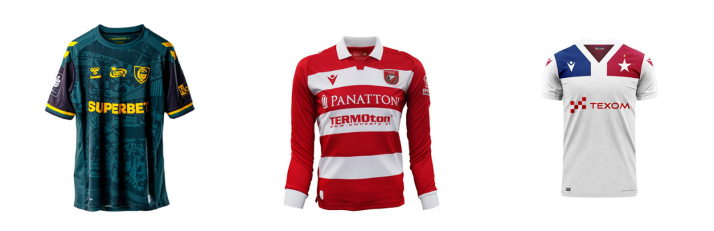 Wisła Kraków – koszulka wyjazdowa. Biała koszulka została zaprojektowana z geometrycznym, subtelnym wzorem i wyrazistymi blokami kolorów na ramionach – niebieskim i czerwonym – symbolizującymi klubowe barwy. Czerwona gwiazda na piersi to znak rozpoznawczy „Białej Gwiazdy”, a nowy sponsor TEXOM nadaje całości nowoczesnego akcentu. Minimalistyczny styl połączony z mocną tożsamością sprawia, że to jedno z ciekawszych wyjazdowych wydań Wisły.