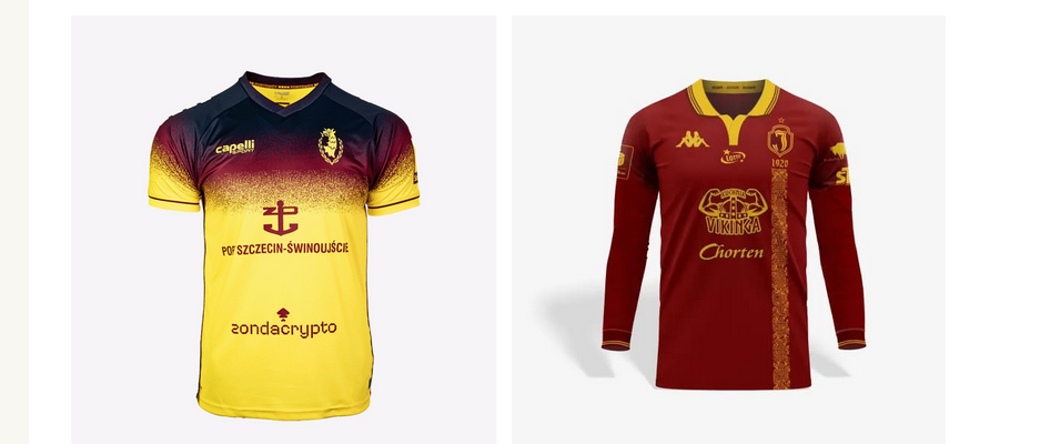Pogoń Szczecin – koszulka wyjazdowa Koszulka Pogoni Szczecin w wersji wyjazdowej wyróżnia się efektownym gradientem przechodzącym z granatu i bordo w intensywną żółć. Na froncie widnieje herb klubu oraz charakterystyczne logo sponsora – Port Szczecin–Świnoujście, podkreślające morski charakter regionu. Projekt jest nowoczesny, a jednocześnie mocno związany z tożsamością miasta i klubu.
