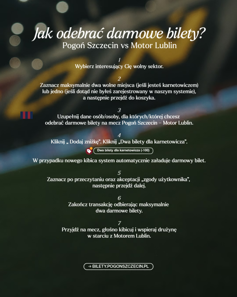 W celu pobrania darmowych wejściówek klub zaprasza na portal bilety.pogonszczecin.pl. Wystarczy wybrać sektor i zaznaczyć maksymalnie dwa wolne miejsca na stadionie. Następnie przejść do koszyka, uzupełnić dane osób dla których kibic chce odebrać bilety i kliknąć „dodaj zniżkę”. Wówczas należy wybrać „dwa bilety dla karnetowicza”. To już prawie wszystko! Wystarczy jeszcze zaakceptować „zgodę użytkownika” oraz dokończyć transakcję.