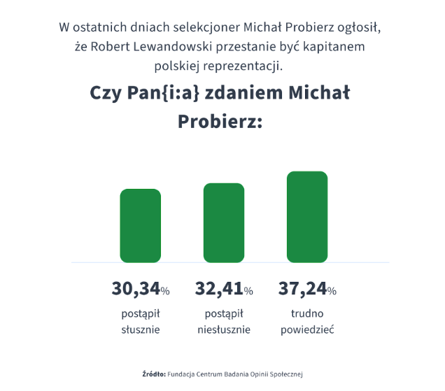 Jak wynika z badania CBOS, część kibiców – a dokładniej 30,34% – ocenia ruch Probierza jako uzasadniony – w końcu kapitan kadry powinien bezwzględnie pojawiać się na zgrupowaniach. Nieco więcej Polaków jednak nie zgadzało się z decyzją Probierza (32,41%). Nie jest tajemnicą, że „Lewy” w dalszym ciągu jest uwielbiany przez dużą rzeszę polskich kibiców. Ich niezadowolenie słychać było zwłaszcza podczas ostatniego meczu towarzyskiego z Mołdawią.