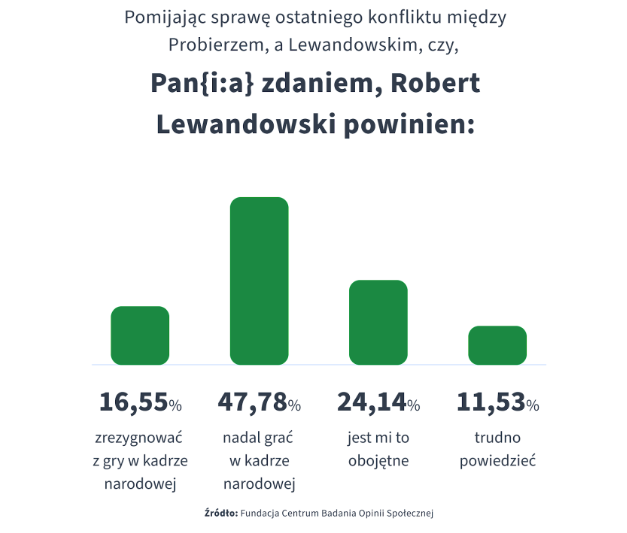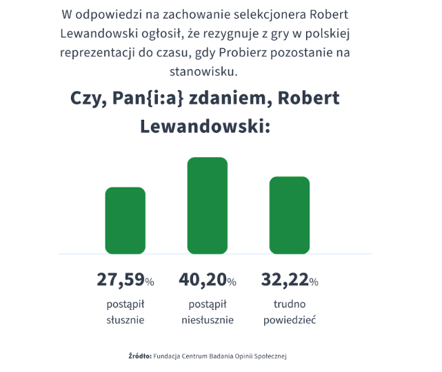 Sam konflikt trenera z najlepszym polskim piłkarzem w historii uderzył również w „Lewego”. Na pytanie o to, czy jego decyzja o rezygnacji z gry w kadrze, dopóki nie dojdzie do zmiany na stanowisku trenerskim, negatywnie oceniło aż 40,2% Polaków, podczas gdy pozytywnie – jedynie 27,59%.